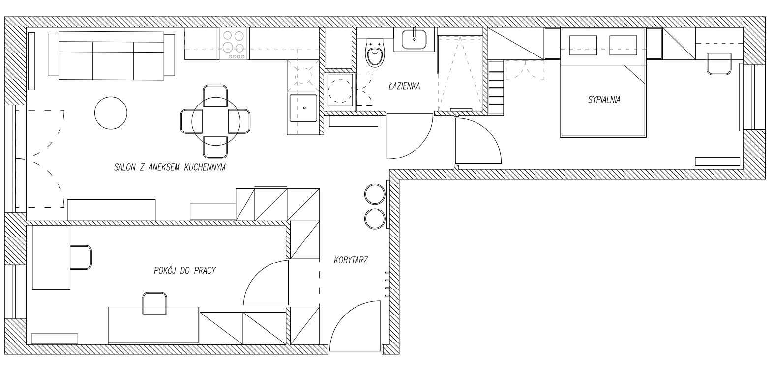 Przy niewielkim salonie z aneksem kuchennym wyzwaniem było takie zaplanowanie przestrzeni, aby była nie tylko estetyczna, ale przede wszystkim wygodna w codziennym użytkowaniu. Kluczowym krokiem okazało się delikatne przesunięcie ściany w stronę pokoju pracy - zmiana, która otworzyła nowe możliwości aranżacyjne.