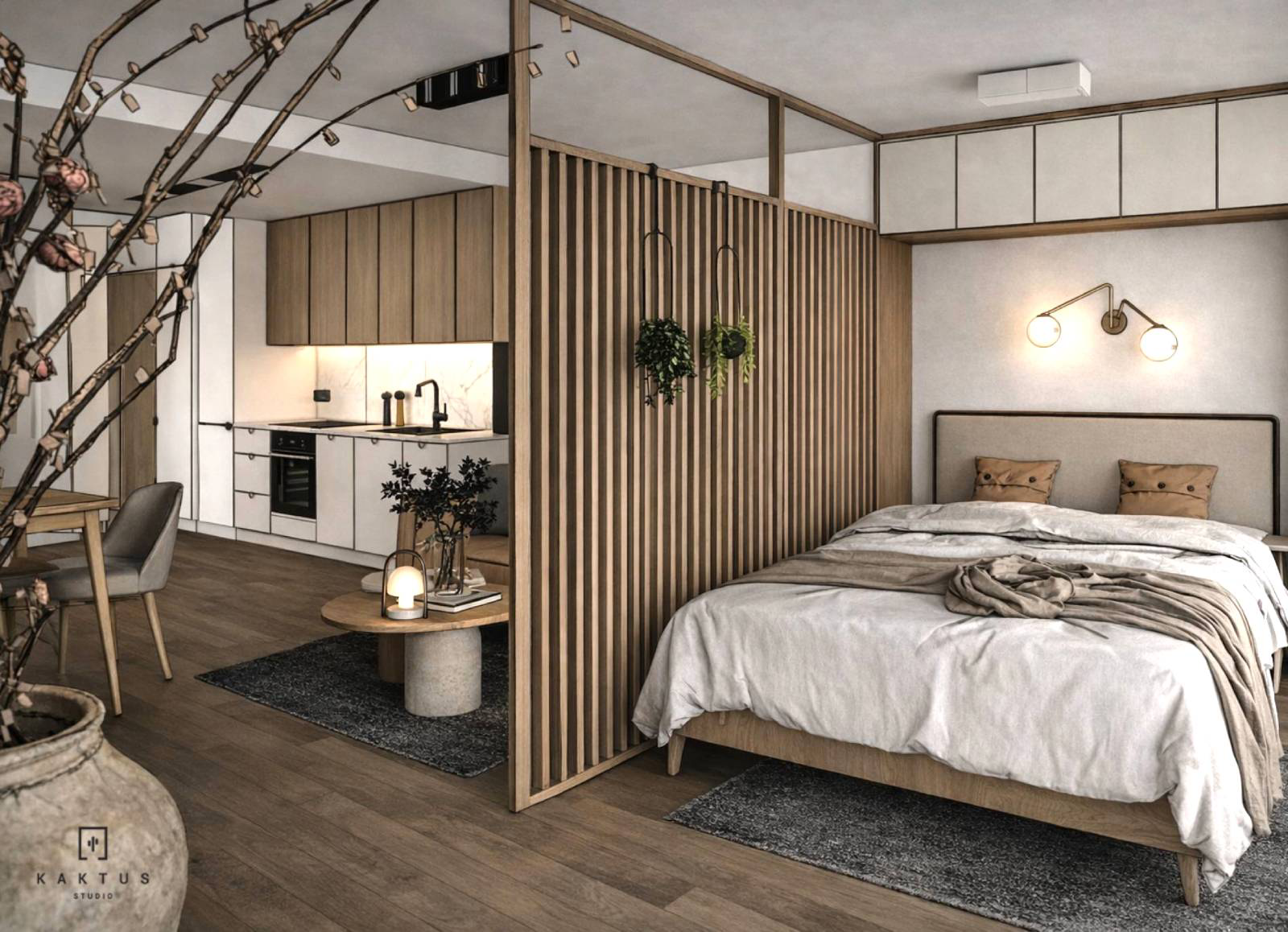 Mimo braku możliwości wydzielenia osobnej sypialni, udało się wyraźnie zdefiniować strefę spania. Łóżko zostało subtelnie oddzielone wysokimi drewnianymi lamelami, co zapewnia poczucie prywatności, nie blokując przy tym naturalnego światła w pozostałej części mieszkania.
